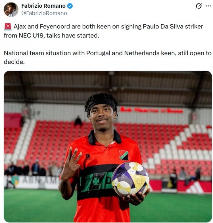 1月8日讯 据知名转会记者罗马诺报道,阿贾克斯和费耶诺德都对NEC U19的前锋保罗·达席尔瓦表现出浓厚兴趣。